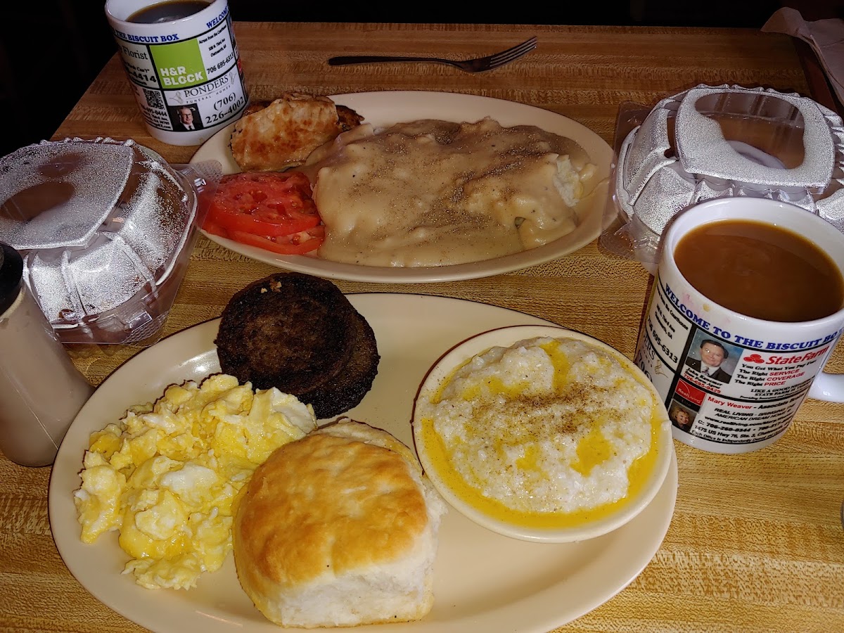 My fiancee and myself tried biscuit box for the first time a few months ago. When we first went i had a chicken biscuit with cheese and tomatoe and it was amazing. My fiancee had two eggs, sausage and two pancakes and needless to say the pancakes were HUGE, the size of the plate snd he said they were tur best he had ever had. We go there every week now. We love this place and the staff is always really nice and honestly you cant beat their prices.